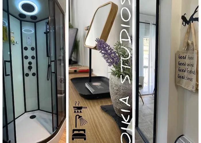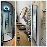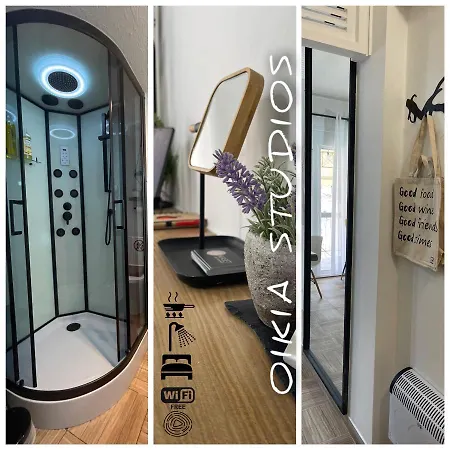 L'appartement Oikiastudios dispose d'un patio, d'un balcon et d'un coin salon, ainsi que de conforts tels qu'une climatisation. Pour plus de commodité, une baignoire spa, une douche à l'italienne et une toilette séparée sont disponibles dans ce logement. Un sèche-cheveux, des peignoirs de bain et des serviettes sont également accessibles.